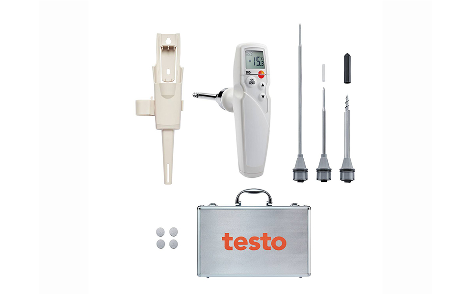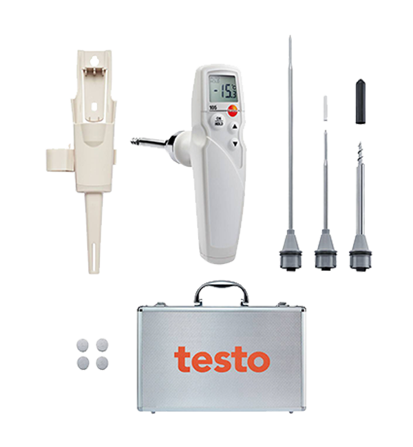 testo 105擁有各項(xiàng)專業(yè)食品溫度計(jì)應(yīng)有的特性,以簡(jiǎn)化您的生活及工作:?jiǎn)问植僮?;緊湊及人性化的設(shè)計(jì);帶背光燈的顯示屏;可自由設(shè)定的限值;超限時(shí)發(fā)出聲光報(bào)警;并標(biāo)配支撐夾以及探頭支架。