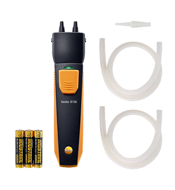 testo 510i 無線迷你差壓測量儀 ,包括帶適配器的軟管組件(直徑4毫米和5毫米)、電池以及校準協(xié)議。