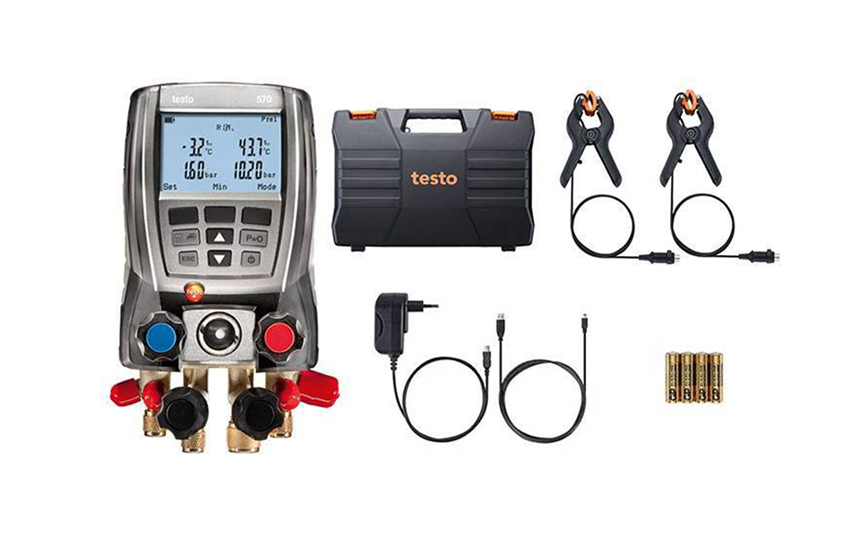testo 570 專業(yè)級電子冷媒表組套裝、包括主機,4通閥組,內部數(shù)據(jù)存儲器、集成真空測量探頭,3個溫度探頭連接,2個鉗形探頭、testo EasyKool 專業(yè)電腦操作軟件(用戶可下載)、USB數(shù)據(jù)線,儀器箱、電源適配器,電池以及出廠報告。