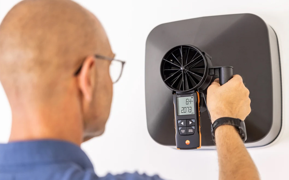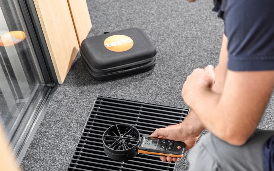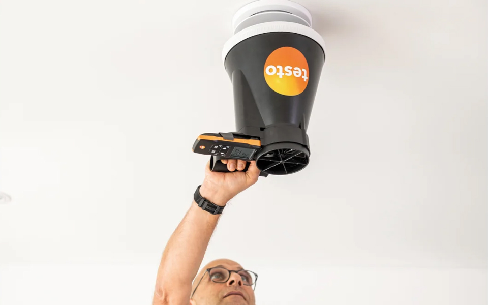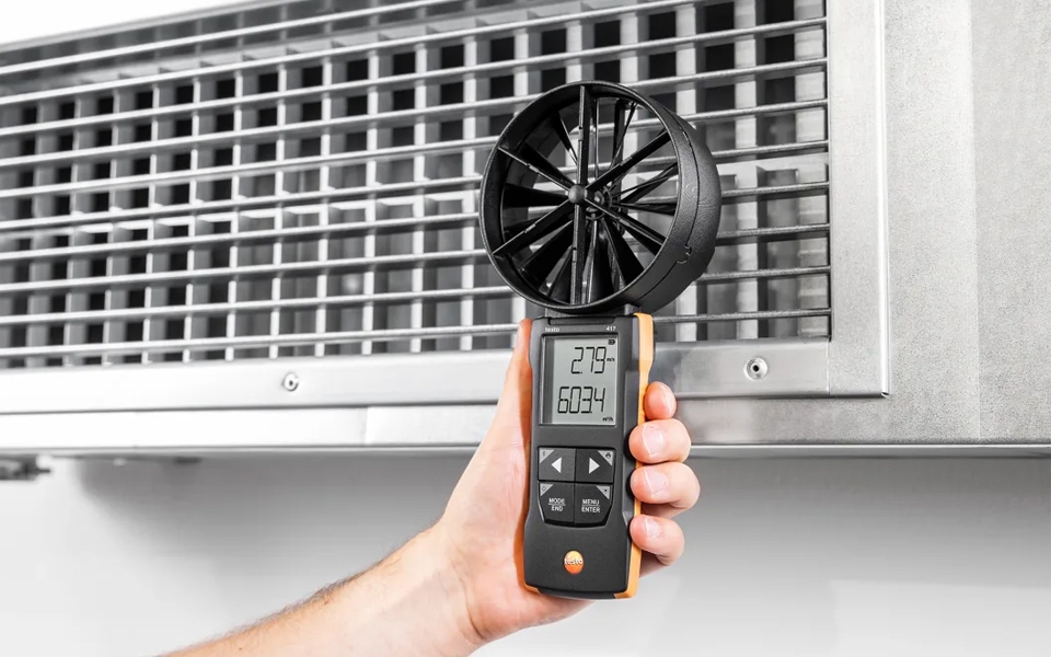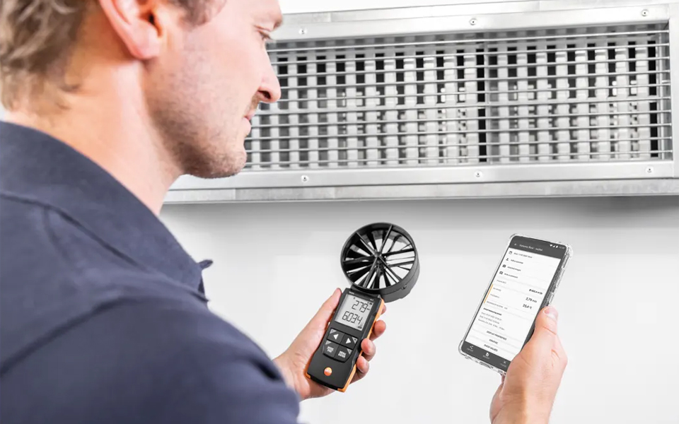 testo 417葉輪風(fēng)速計,快速精確地測量空調(diào)和通風(fēng)系統(tǒng)進風(fēng)口和出風(fēng)口風(fēng)速風(fēng)量。有效調(diào)節(jié)住宅平衡通風(fēng),并使用testo Smart APP快速地記錄。